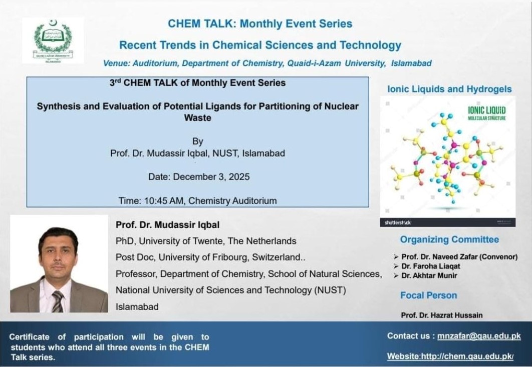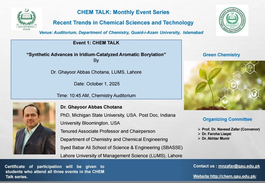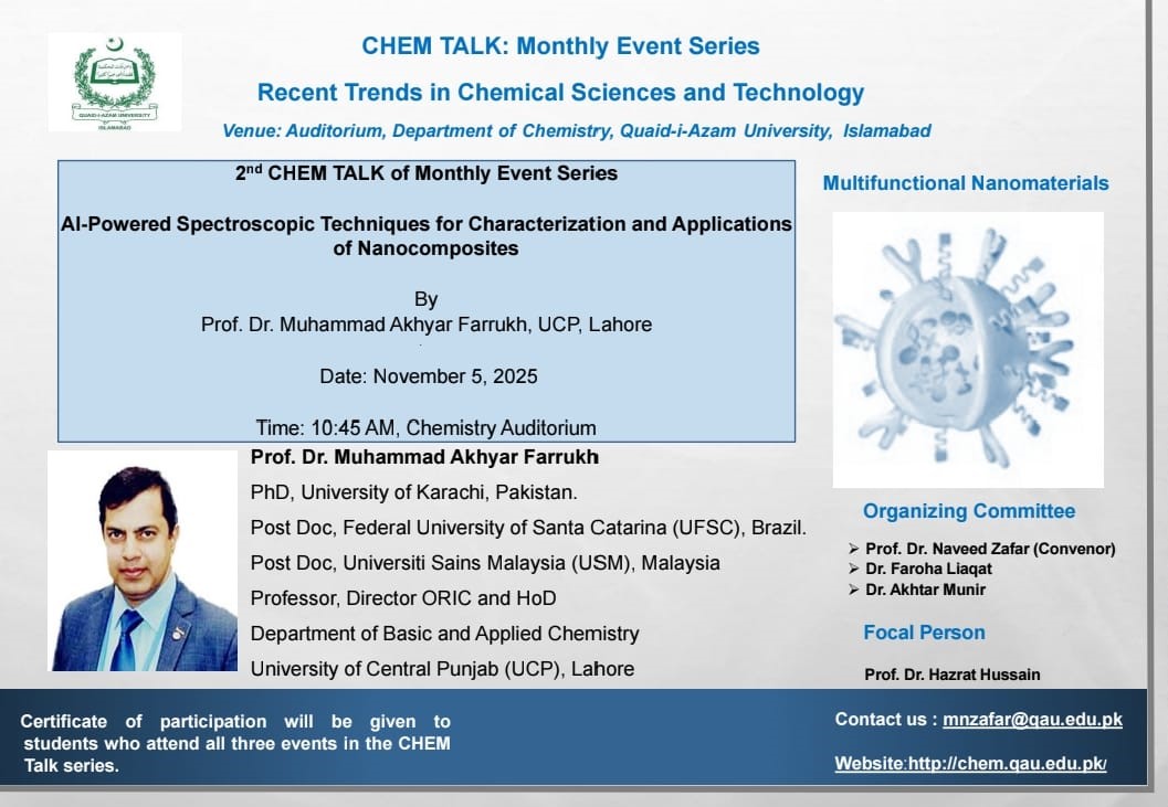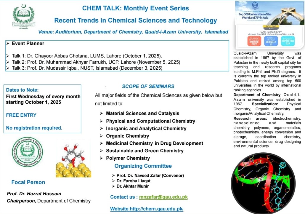 The CHEM TALK: Monthly Event Series is an initiative of the Department of Chemistry, Quaid-i-Azam University, Islamabad, designed to highlight recent trends and advancements in chemical sciences and technology. Each month, leading national scholars and researchers are invited to share their expertise, research findings, and perspectives with students, faculty, and professionals.
